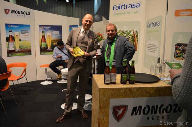 Bareld Kootstra van Global Fruit en Jan Fleurkens van Mongozo in de gecombineerde 'Fairtrade-stand'. Jan liet bezoekers proeven van het nieuwe biologische, glutenvrije en fairtrade gecertificeerde witbier 'Mongozo Buckwheat White'.