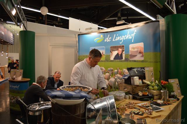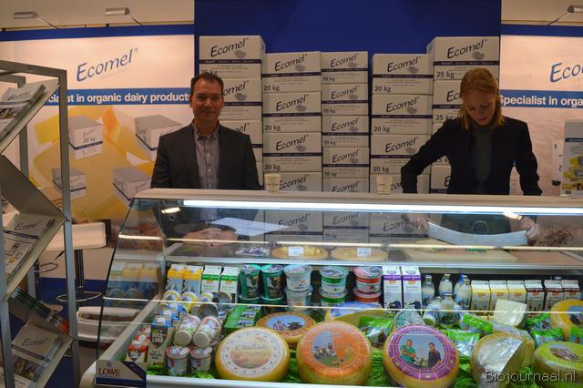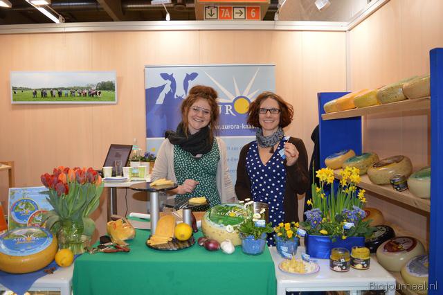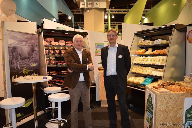 Albert Roozendaal en Wolter Prins in de combinatiestand van Commandeur Ekovlees en World Wide Cheese. Rechts konden de bezoekers onder meer proeven van de biologische rookkaas.