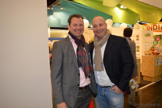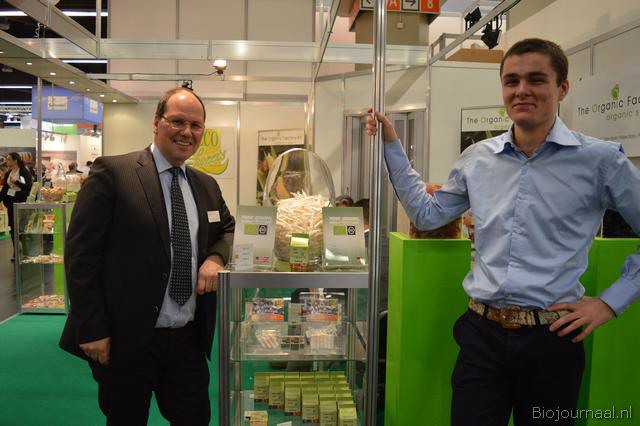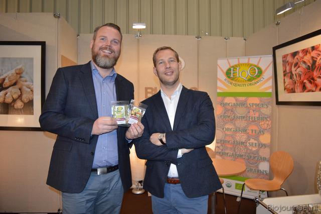 "Stephan Compagner en Peter Barnhoorn van High Quality Organics. Stephan: "We stonden vorig jaar voor het eerst op de BIOFACH en dit bleek voor herhaling vatbaar." Hij toont de nieuwe boerenkoolpoeder ("Dit is de nieuwe superfood.") en een zoutloze seasoning voor vlees."