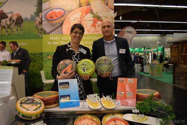 Marja Bastiaansen en Klaas Hokse tonen de nieuwe kazen van Bio Kaas. Nieuw zijn o.a. kaas met hennep, coco cabana (kokos) en met pompoenpitten.