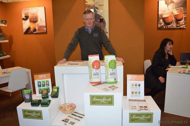 "Rob Sikkema presenteerde de nieuwe kiloverpakkingen koffie van Simon Lévelt. "Hiermee focussen we ons op de zakelijke markt." Links zijn de nieuwe verpakkingen van de losse thee te zien. "Deze thee maken we nu weer zelf."