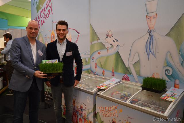 Fred van Tienen en Aart Broek van The Organic Factory, met tussen hen in de kleine fruit- en pepermuntrolletjes die op de beurs gepresenteerd werden.