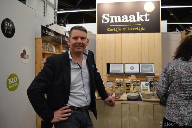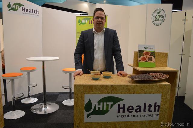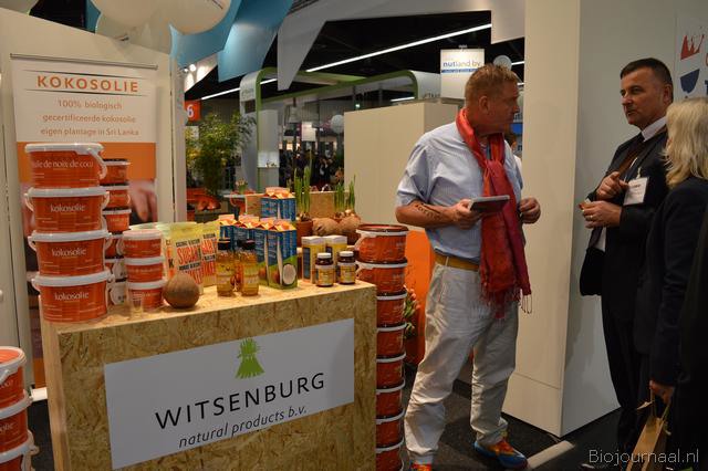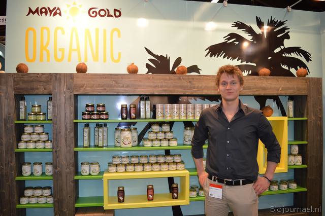 "Jelle Eitjes van Maya Gold Trading uit Amsterdam. Maya Gold Trading is gespecialiseerd in kokosnootproducten. "We importeren alles zelf. De kokos is afkomstig uit de kokosdriehoek in Sri Lanka. We staan voor het eerst met ons eigen merk op deze beurs. We werken ook steeds meer met hennepzaden en hebben een superfoodlijn."