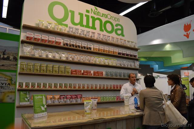 Mark Kadee met achter hem de nieuwe producten van Nature Crops, onder meer: quinoarepen, Italiaanse pasta's, 'instant soup'.
