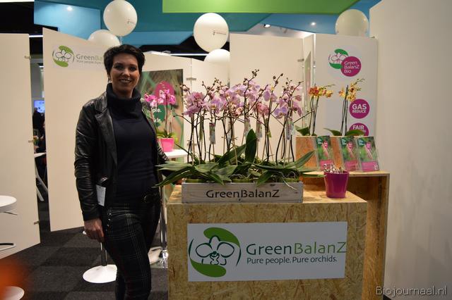 "Vivien Zweekhorst met de biologische Phalaenopsis orchidee van GreenBalanZ. Het bedrijf mag zich als enige bloeiende kamerplantenteler in Nederland 'biologisch' noemen. "We zijn benieuwd of de bio-consument een meerprijs over heeft voor producten die niet door de mond gaan."