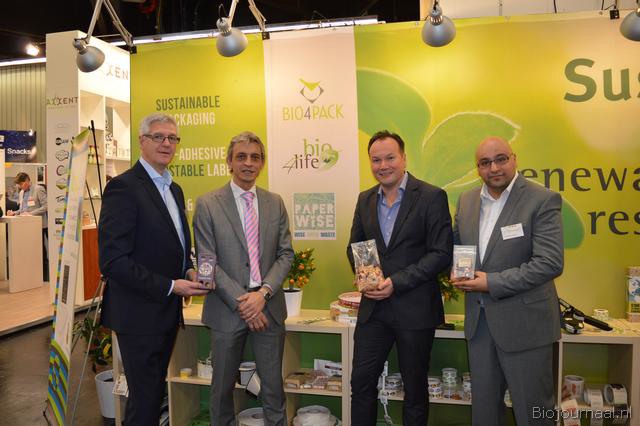 Links Peter van Rosmalen van PaperWise (gebruikt landbouwafval als grondstof voor papier), daarnaast Arjan Klapwijk van Bio4Life en rechts Patrick Gerritsen en Yasar Türkoğlu van Bio4Pack.