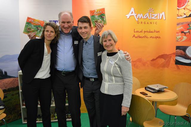 "Annemiek Flantua, Maarten Gevers, Ruben de Wit en Martha Jeuken met de nieuwe 'extra fibre tortilla wraps' van Amaizin. Maarten: "Ze waren er net op tijd voor de beurs, ze zijn gisteren pas geproduceerd."