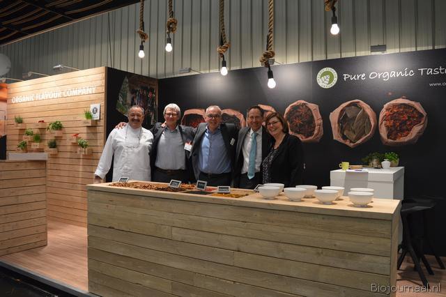 "Het beursteam van Organic Flavour Company: Gert Klinkenberg, Peter van de Steeg, Oeble Kempenaar, Aart de With en Angelien Beek. Nieuwe smaken die presenteerden waren Mojito en Sambuco. Aart: "We laten deze smaken als chips proeven. Hierbij willen we ook laten zien dat we in scherpte kunnen variëren. We zijn erachter gekomen dat staatssecretaris Dijksma graag onze Piramide Sterrenmix drinkt."