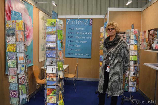 "Janna Kaniok presenteerde de nieuwe kaartenlijn van ZintenZ. "In Nederland zijn onze kaarten al verkrijgbaar bij EkoPlaza. We hebben naar deze beurs ook onze Duitse kaarten meegenomen."