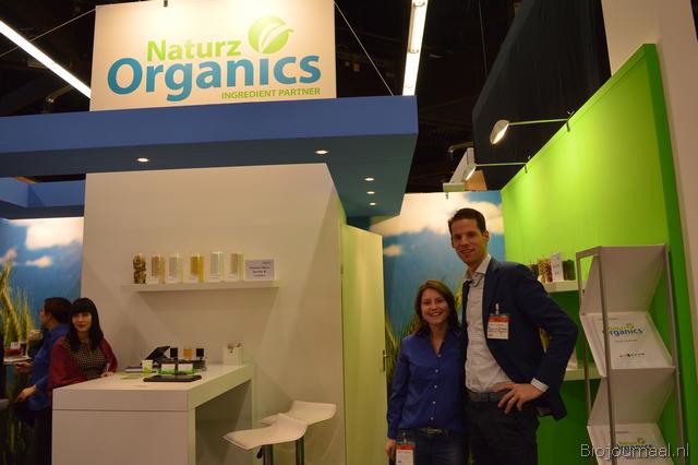 "Jade Couwenberg en Roy van Diemen van Naturz Organics Europe. Roy: "We vervelen ons geen moment op deze beurs en zijn niet voor niets met een groot team vertegenwoordigd. Er zijn ook collega's uit China, Hong Kong en de VS aanwezig. Ons bedrijf groeit best hard. Dit toont volgens mij aan dat het werkt om een hoofdkantoor buiten Europa te hebben."