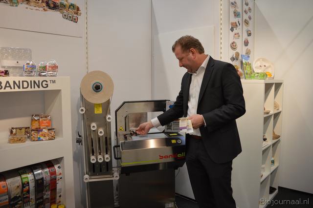 "Erik de Roos van Bandall Benelux in de stand van Max Aarts. Erik: "Ik laat hier ons 'heat sealable branding paper' zien. Deze plakken we met een 'hot melt' op waterbasis."