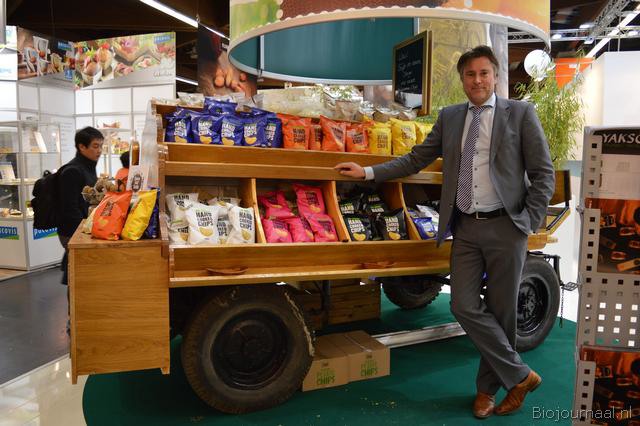 "Bjorn Andringa van FZ Organic Food presenteerde met trots de nieuwe hand cooked chips van Trafo in de smaken cheese onion, rosemary en barbecue. "Deze zijn echt vers van de pers, we hebben ze nog op het nippertje voor de beurs kunnen produceren." De wagen waarin de chips gepresenteerd werd is 15 jaar geleden gekocht door de vader van Bjorn. Hij is door de Friese Poort in Drachten gerenoveerd."