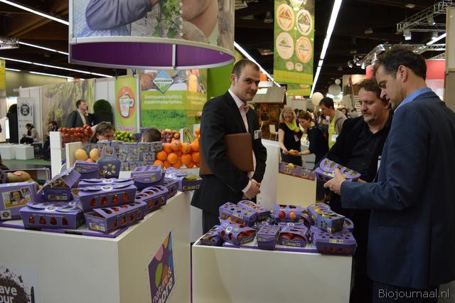 Alexander Maksimovic (links) en Gert Kögeler (rechts) geven extra toelichting over de verpakkingen van Nature & More, het 'trace & tell'-merk van Eosta.