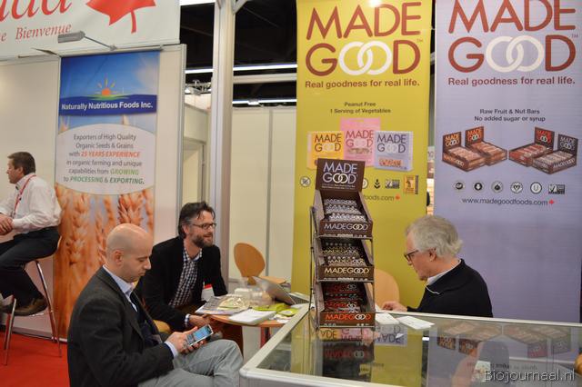 Andy van Ham (midden) van Riverside International was ook dit jaar van de partij. De Made Good-repen worden in een fabriek in Canada geproduceerd. Het bedrijf zoekt nog afzet in Nederland.