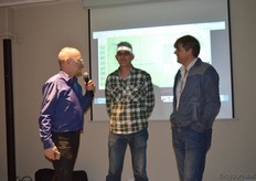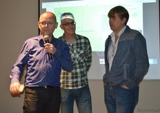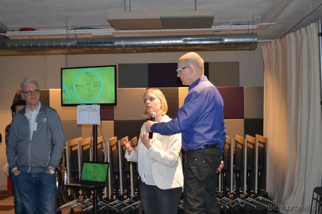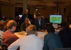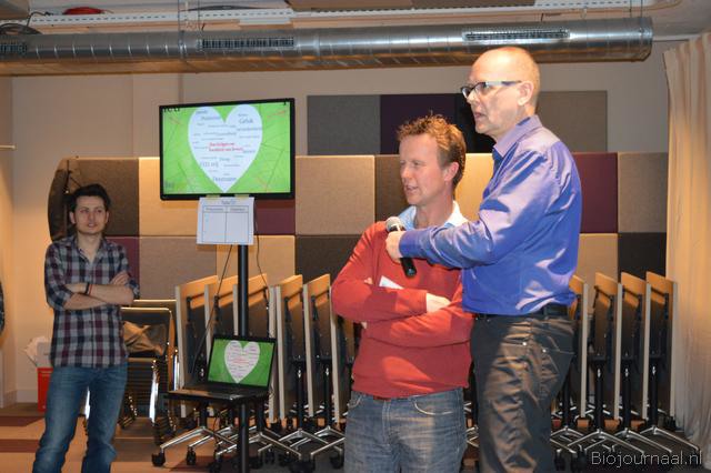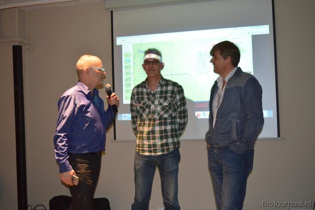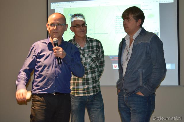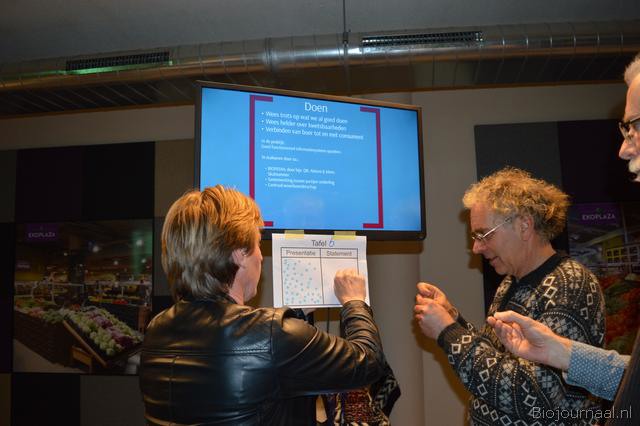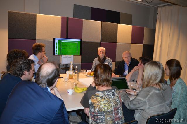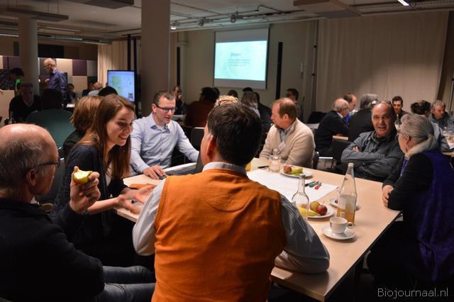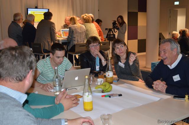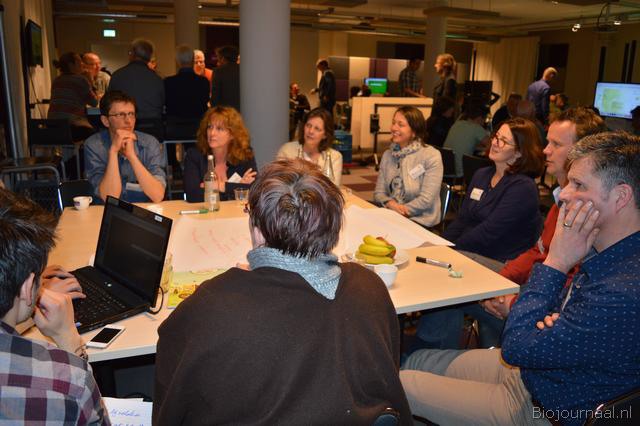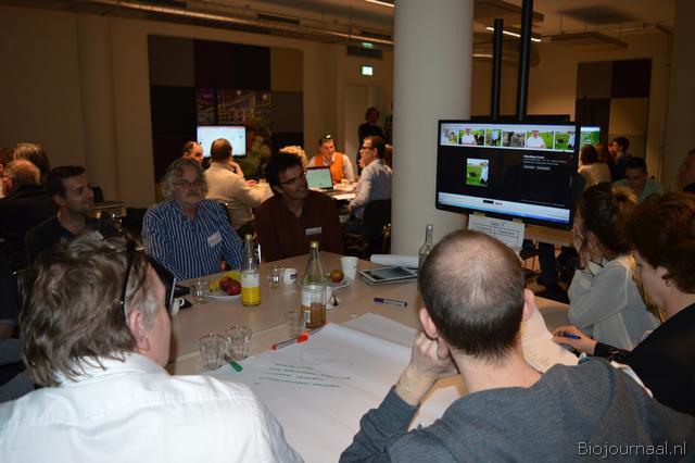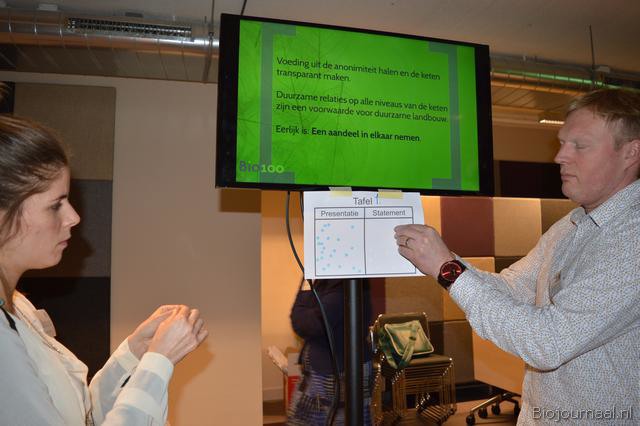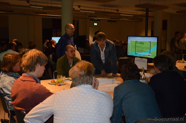 Hans van Mierlo (Udea) was bij tafel 10 (Voorlichting, communicatie, informatie, kennis) verantwoordelijk voor het maken van de presentatie. Rechtsachter bio-akkerbouwer Douwe Monsma. Naast hem biologische fruitteler William Pouw.
