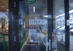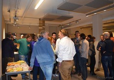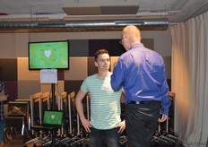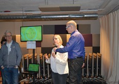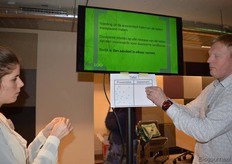 Links Leonie van der Velden (Bionext) in gesprek met Kees Scheepens (op de rug gezien). Achter de laptop Ekoplaza-formulemanager Geert-Jan Smits.