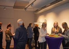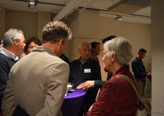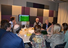 Erik Does, directeur Udea (op de rug gezien) in gesprek met Thea Broos. In het midden Cor Pot (consument).