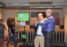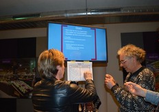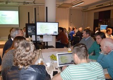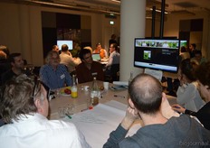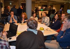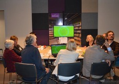 Tafel 7 (Duurzaamheid, aarde en milieu): In het gestreepte overhemd Jurrien Roossien van DO-IT en links op de rug gezien Klaas de Lange van Weerribben Zuivel. De groep is hier net op zoek naar een foto van hem om in de presentatie te verwerken.