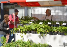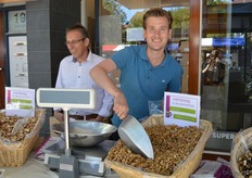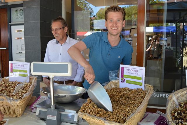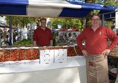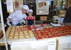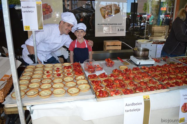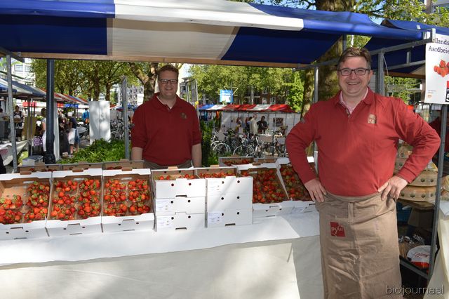 "Herbert Boonstra en Peter van der Schoot hadden de kraam van Kroon Biologische Verswaren gevuld met de BD-aardbeien van Tuinderij de Kromme Lepel in Bergen op Zoom. "De aardbeien van Peet de Krom doen het altijd goed bij het publiek", aldus Peter."
