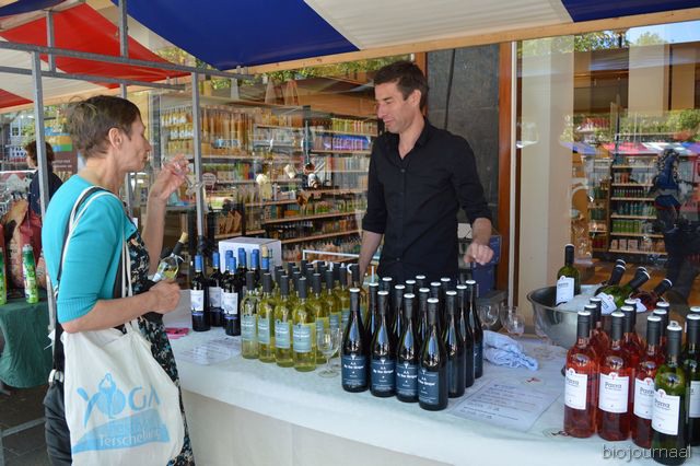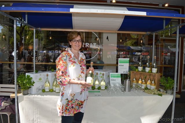 "Eveline Scheren van Biowijnclub presenteerde de biologische wijn Hugo op de markt. "Ik ben blij dat ik nog deel mocht nemen aan deze markt, aangezien deze wijn pas sinds Pinksteren bij Gimsel in het schap staat."