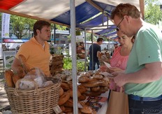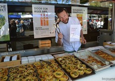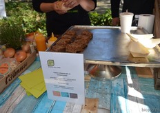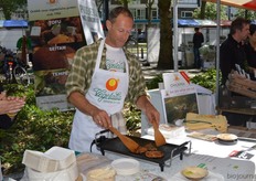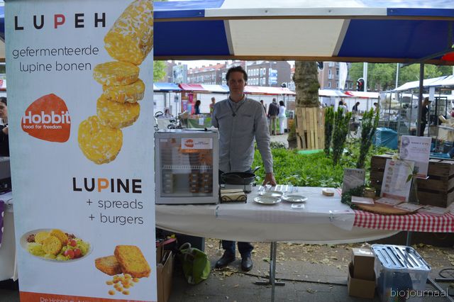 Jeroen Koedam stond namens De Hobbit op de markt. Hij bakte voor de bezoekers onder meer de nieuwe lupineburgers en men kon proeven van de lupinespreads.