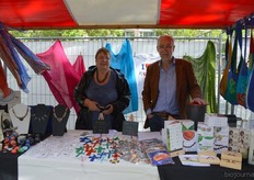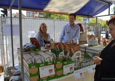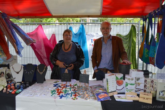 Jolanda Huizing en Daan van der Mooren poseerden spontaan in de kraam van Yarrah toen ze de camera van Biojournaal zagen.