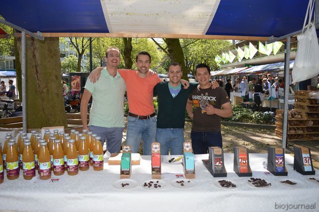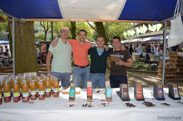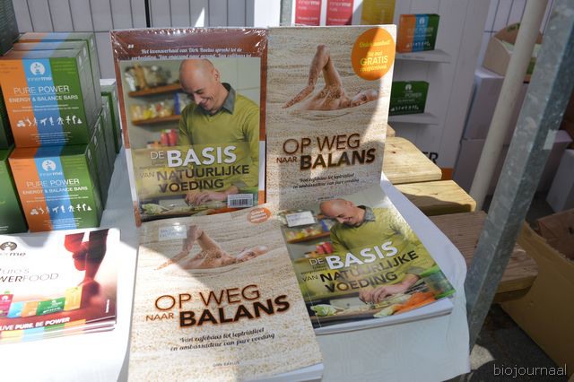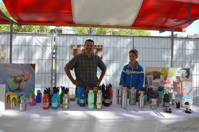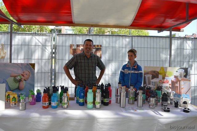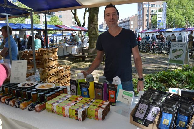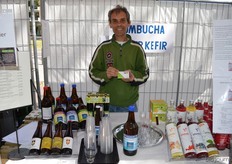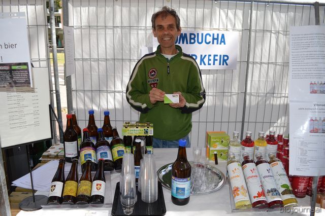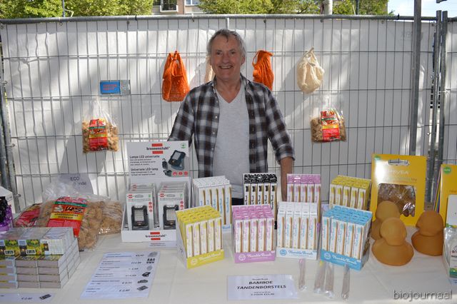 Erik Schramme in de kraam van Biobel. Biobel vertegenwoordigt diverse merken, waaronder Leireken (biologisch bier), Thylbert, EveryOne en Food Plus (voedingssupplementen).