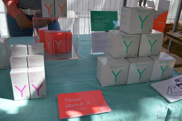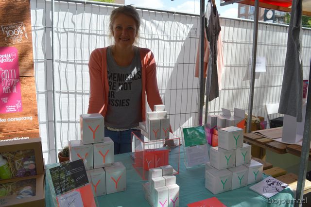 "Wendelien Hebly presenteerde het vrij nieuwe merk Yoni op de Lentemarkt. "Ons maandverband en onze tampons, gemaakt van biologisch katoen, zijn sinds eind vorig jaar in productie." Voor de promotie gebruikt ze de toepasselijke slogan 'Chemicals are not for pussies', ook te zien op haar shirt."