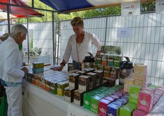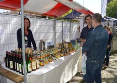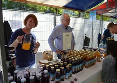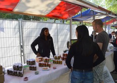Ilse Reitsma staat letterlijk achter de producten van imkerij De Traay. Rechts is haar collega Aart Jansen in gesprek met een geïnteresseerde.