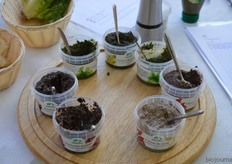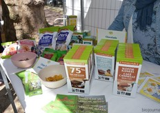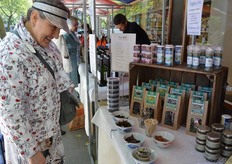 Kirsten van der Linden stond namens TerraSana op de Lentemarkt. Zij liet bezoekers proeven van de verschillende notenpasta's.