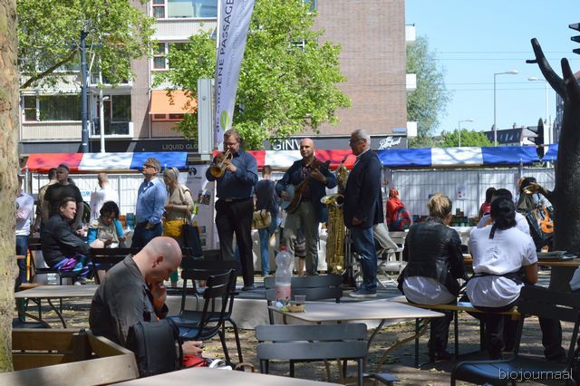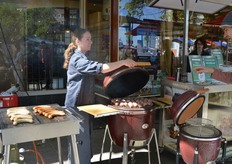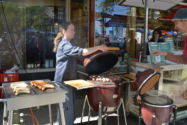 "Bij Stephanie kon men proeven van diverse producten van slager De Groene Weg, die ook in De Groene Passage gevestigd is. Ze maakte onder meer curry braadworst en 'Moinkballs' klaar. "Ik krijg goede reactie, biologisch vlees smaakt toch heel anders dan regulier vlees."