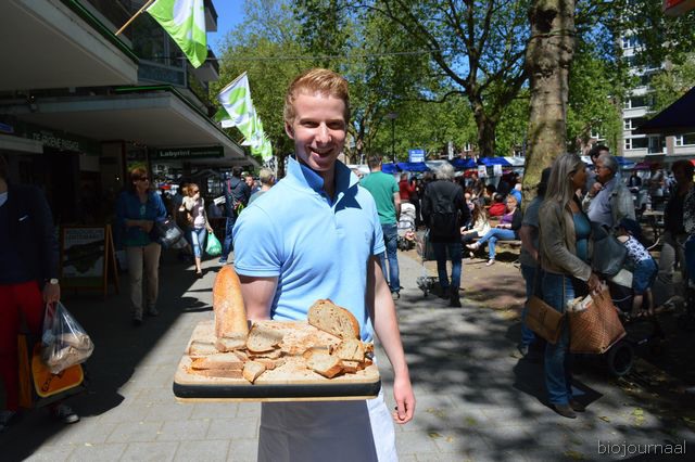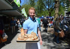"William met een plank vol bio-brood van Vanmenno. "Het is goed om te merken dat veel mensen ons brood al kennen."