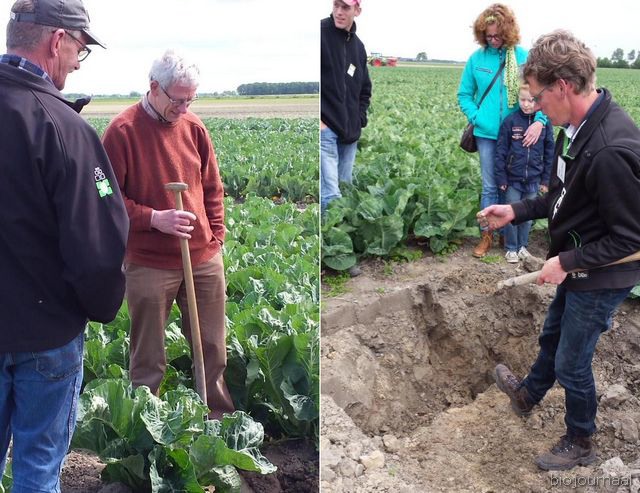 "Thijs is erg geïnteresseerd in plantenziekten en plagen. Hij heeft het verhaal van Meino hierover dan ook uitgebreid beschreven: "Plantenziekten en plagen lijken goed te voorkomen door de bodem te vertroetelen met een ruime 1 op 6 vruchtwisseling en het onderspitten van natuurcompost en biologische drijfmest. Daarnaast wordt veel gedaan om de natuurlijke vijanden van plaagdieren naar de zin te maken. Houtduiven veroorzaken momenteel wel vraatschade in de ijsbergsla. Een opgehangen draaiende bol die afschrikwekkend zou moeten werken, blijkt dat slechts 2 weken te hebben gedaan. Inmiddels gaan de duiven vlak onder de bol zich te goed doen aan de sla. Een afweerkanon, alsook het laten rondschallen van angstkreten van vogels, zouden wellicht beter helpen, maar dat vindt Meino niet echt een optie, daar ze vlakbij de dorpskern hun bedrijf hebben. Een jager met wie afspraken zijn gemaakt, zou zeker nuttig werk kunnen verrichten. Of moeten we in de toekomst meer heil verwachten van de inzet v