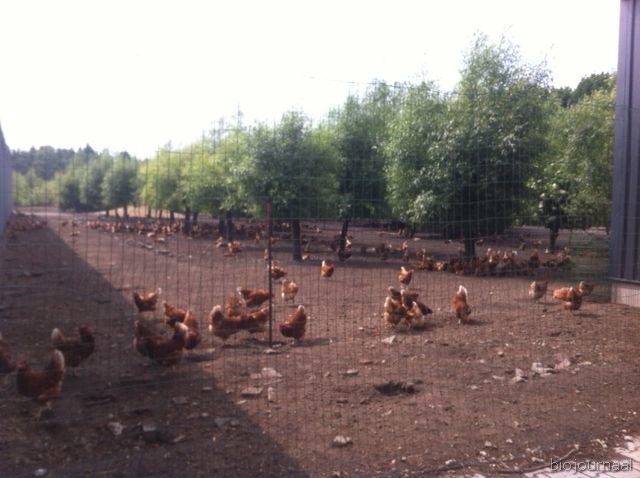 "De rondleiding ging ook door die buitenuitloop, tussen de bomen en struiken. Gras stond er niet meer, dat eten de kippen te snel op. Ze hebben wel goede schuilplekken en speelobjecten. Mijn schoenen werden regelmatig gekeurd/onderzocht door pikkende kippen en bleven gelukkig wel heel."