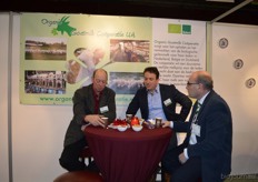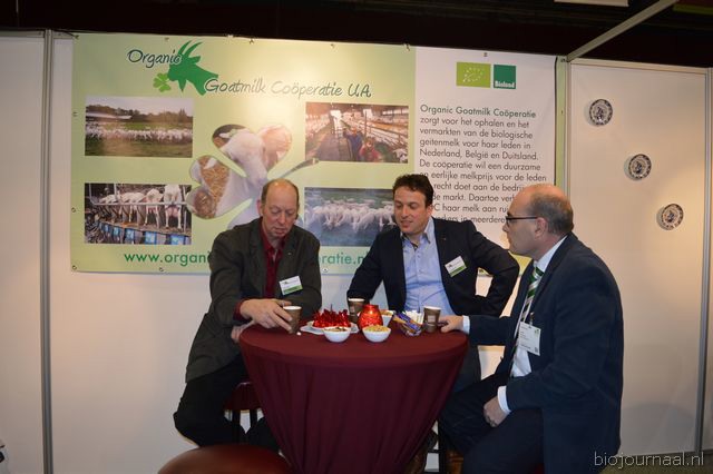 Heinie Alting, Ton van Wolfswinkel van de Organic Goatmilk Coöperatie in gesprek met Johan Jansen van Agrifirm (rechts).