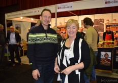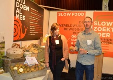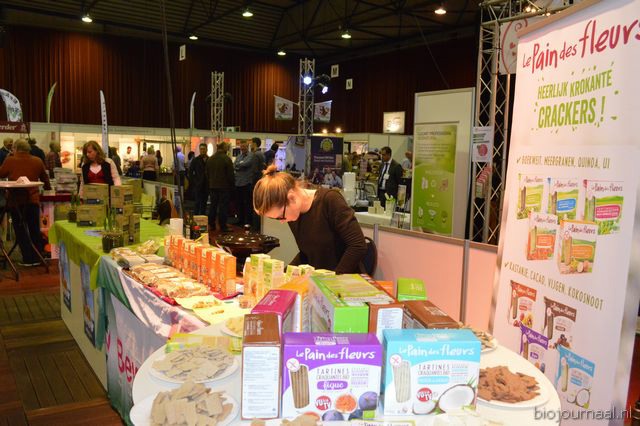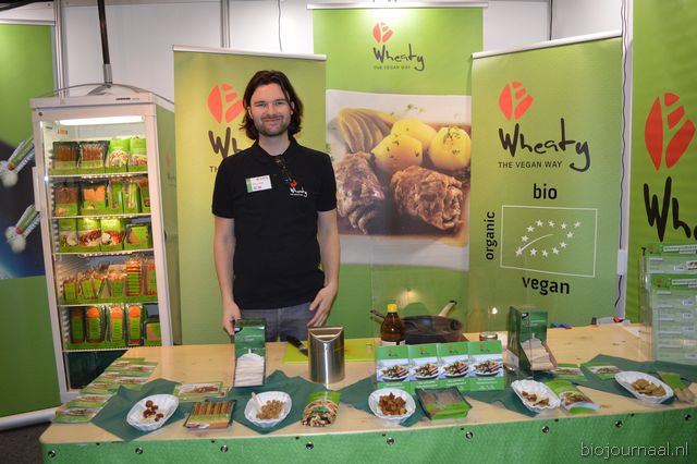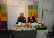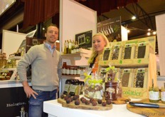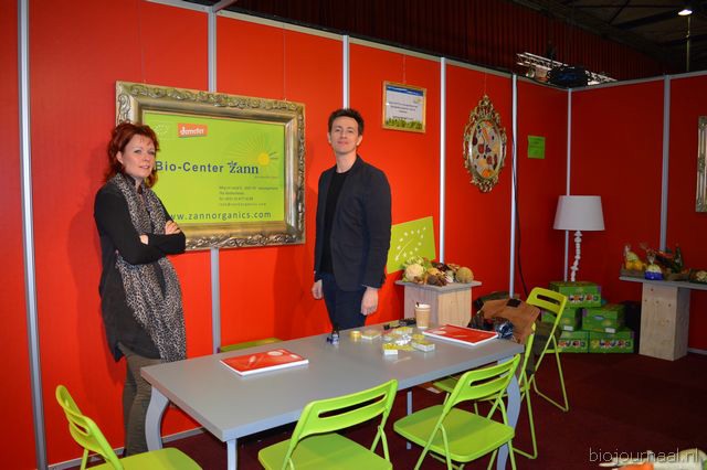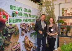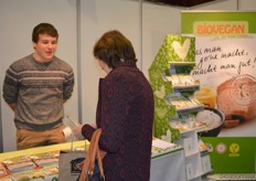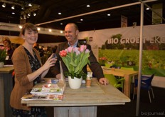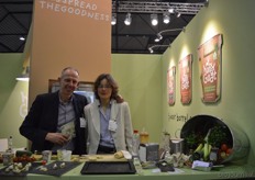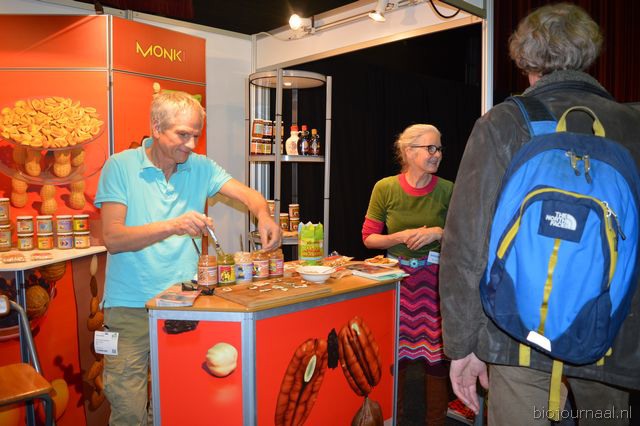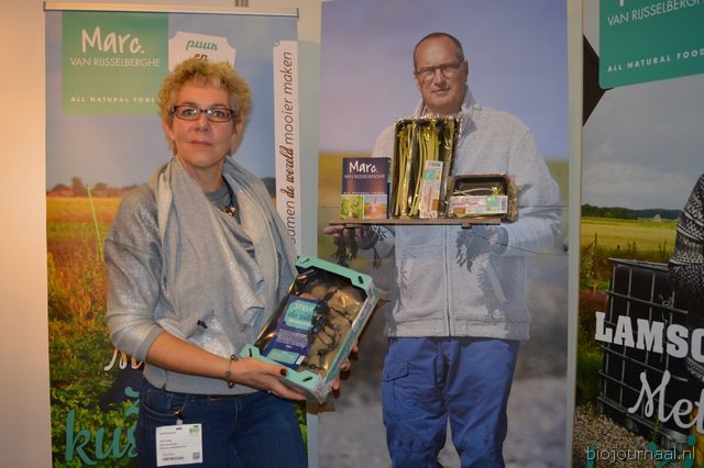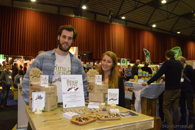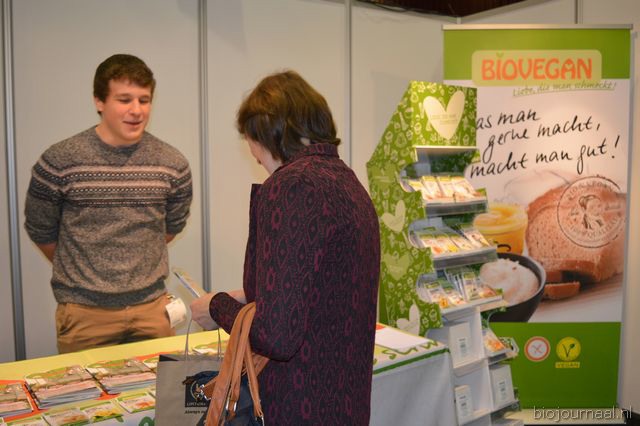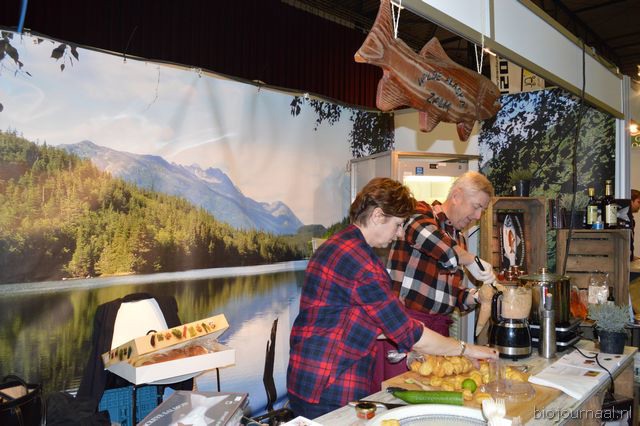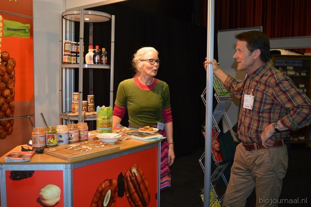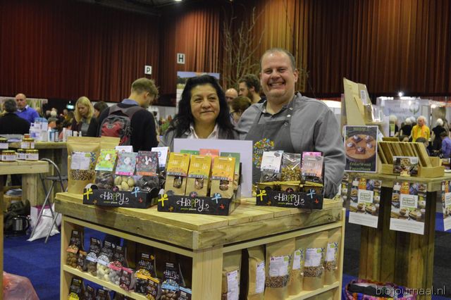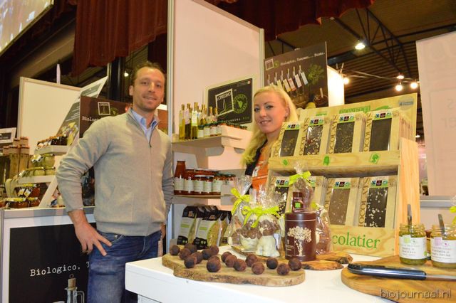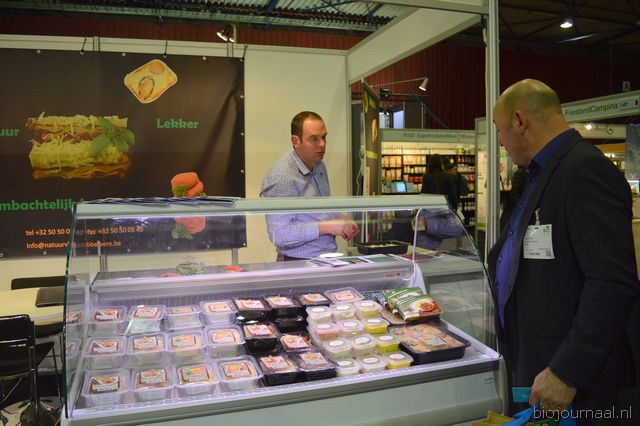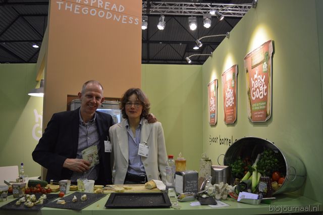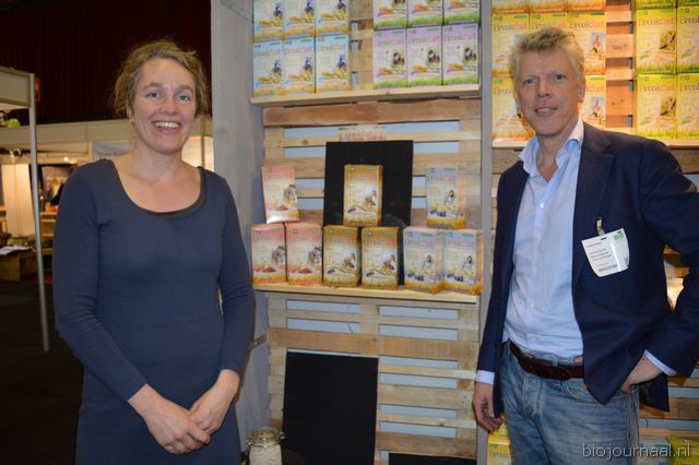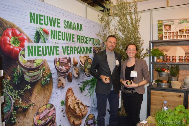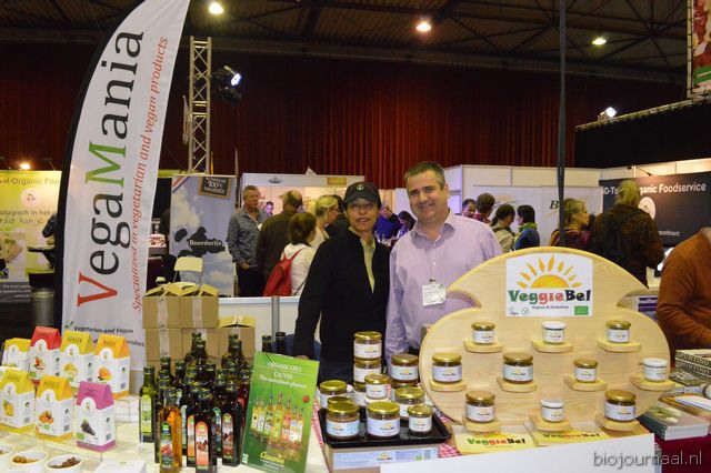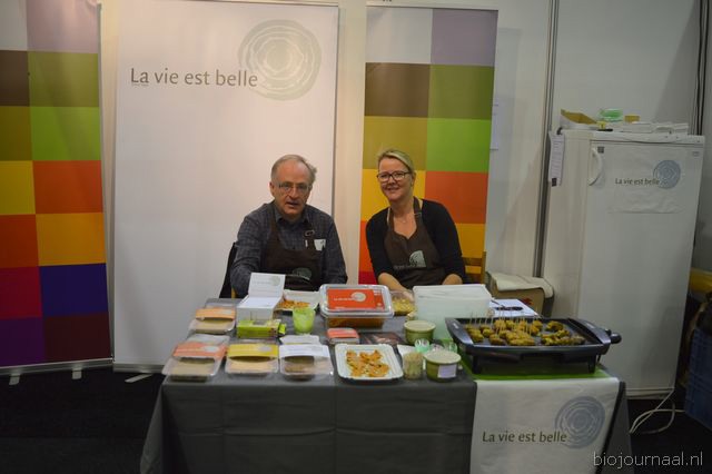 "La vie est belle, de Belgische producent van biologische vegetarische burgers en spreads, stond ook weer op de Bio-beurs. Op de foto Jan-Bart van In en Mirelle Wagenaar. "We willen graag Nederland kennis laten maken met onze producten", aldus Jan-Bart."