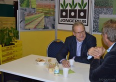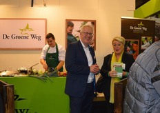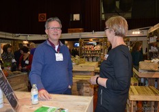 Jan Peter Oosterloo (EkoPlaza's in De Bilt en Bilthoven) op bezoek in de stand van De Nieuwe Band, rechts Ria van Engen van De Nieuwe Band.