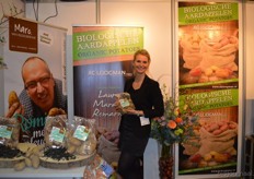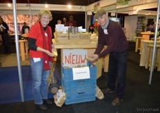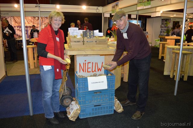 "Edith Lammerts-van Bueren (Louis Bolk Instituut) en biologische teler Niek Vos (Maatschap Vos) tonen trots de resistente bio-aardappel Niek's Witte (ras Bionica). Niek: "We zijn al jaren bezig en merken nu voor het eerst dat deze bijzondere aardappel al bij veel mensen bekend is."