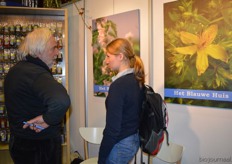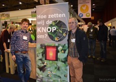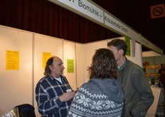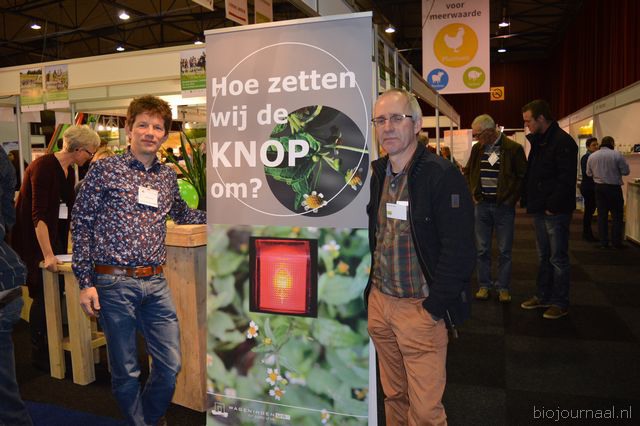 "Hilfred Huiting en Oane de Hoop van Wageningen UR. Hilfred: "We willen tijdens de Bio-beurs in gesprek gaan met telers over de bestrijding van knopkruid. Dit kiemt heel makkelijk en het is niet heel moeilijk te bestrijden, het lastige is dat het heel snel groeit. Ik hoop dat we met z'n allen een oplossing hiervoor kunnen verzinnen."