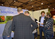 David Damminga van Soiltech laat een geïnteresseerde een flyer zien met meer informatie over Fytaforce biofertiliser. Dit is een extract van hoogwaardige compost dat een grote biodiversiteit aan micro- organismen bevat.