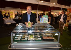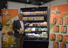 Max Vos van World Wide Food Trade, met achter hem een koeling vol biologisch kipproducten van het merk Ekopuur.