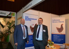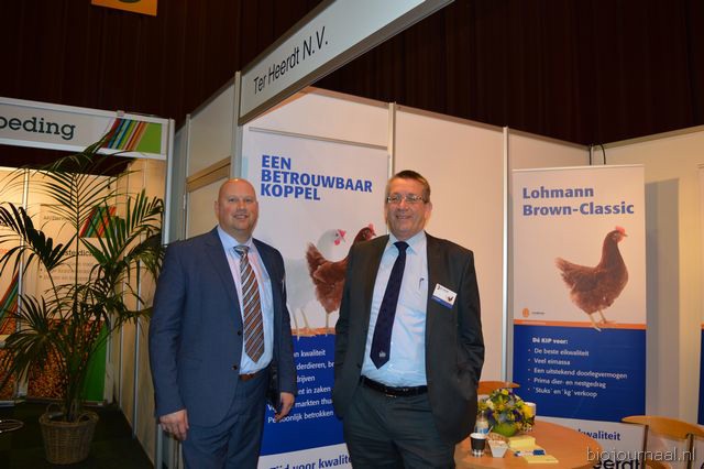 Gerben van Veldhuizen en Cor Salentijn van Brons Voorthuizen, leverancier van biologische voeders. Cor heeft ruim twintig jaar ervaring, toen heeft hij voor het eerst een legpluimveehouder geholpen in de ombouw van gangbaar naar biologisch.