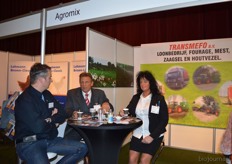 Een onderonsje in de stand van Agromix. Gert van Drie (links, Agromix) in gesprek met Gerry en Jan de Klein en twee ondernemers die zich oriënteren op omschakeling naar de biologische werkwijze.