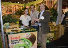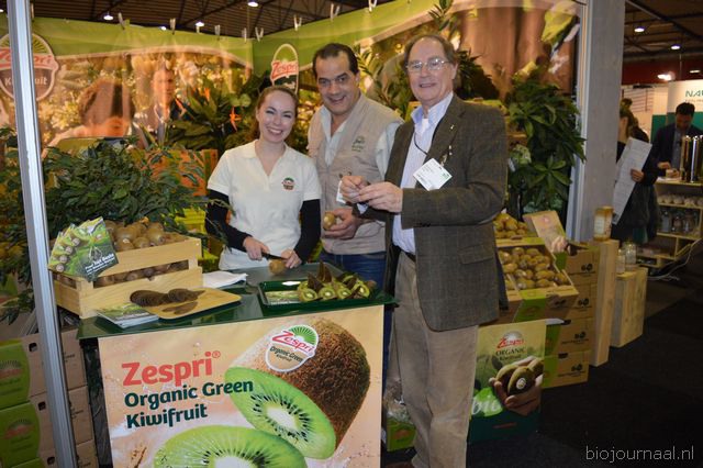 Lisa Witte en Ton Theunissen van Zespri laten bezoeker Dick Pijpers proeven van de biologische kiwi's.