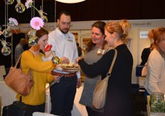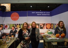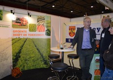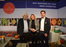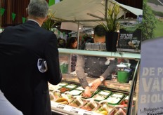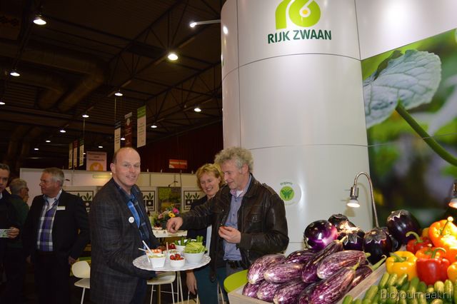 "Daan Heidema en Heleen Bos van Rijk Zwaan. Rechts pakt bio-teler Frank de Koning een tomaatje om te proeven. Heleen: "We willen tijdens deze beurs het Love my salad-concept promoten. Hiermee kan men recepten met groenten uitwisselen."