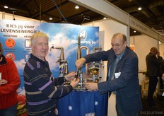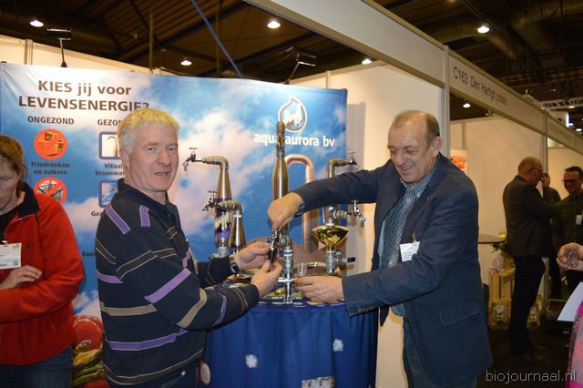 Cor Zandvoort en Henk Pannekoek laten bezoekers proeven van gevitaliseerd water van Aqua Aurora.