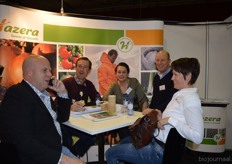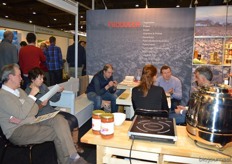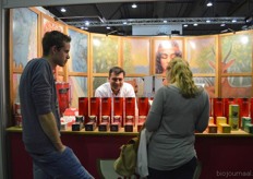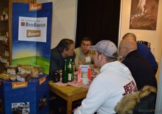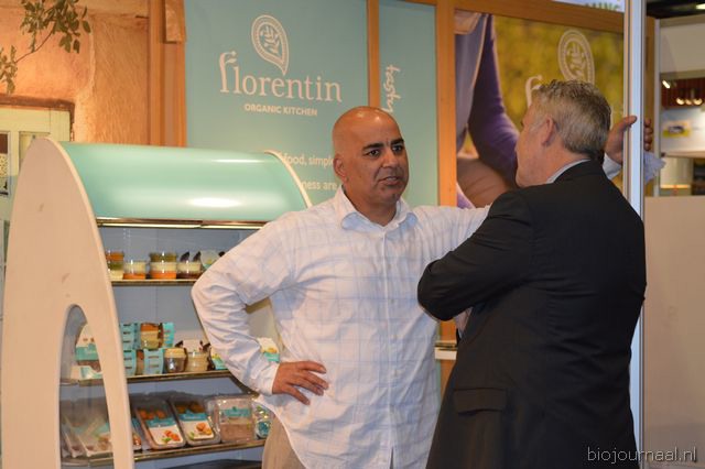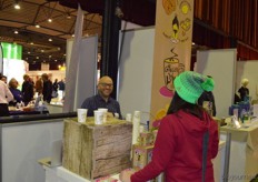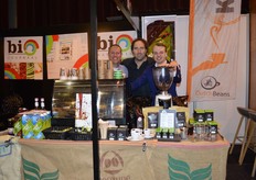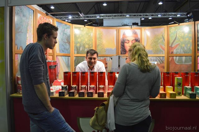 Organic Flavour Company (OFC) liet op de beurs weer proeven van de theeën van de merken Natural Temptation en Piramide. In de zwarte overhemden Arjan Schemer en Oeble Kemenaar van OFC. Ze kregen Pelle en Arjan Nijdam van Ekoplaza Schoorl op bezoek.