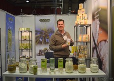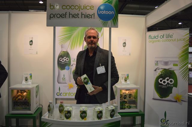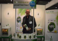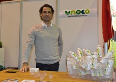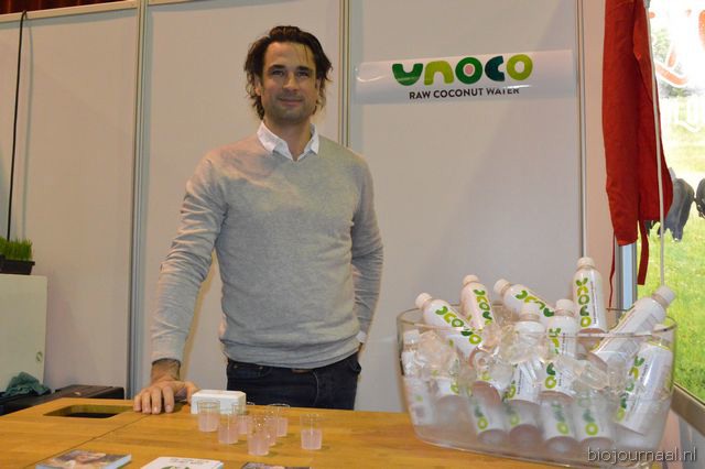 "Het ongepasteuriseerde, verse kokoswater van Unoco wordt vanuit de Filipijnen geïmporteerd. Guido Bruining liet bezoekers proeven van het water. "We zijn de eerste met ongepasteuriseerd kokoswater, hierdoor heeft het water veel gezonde eigenschappen."