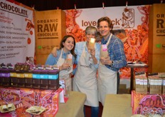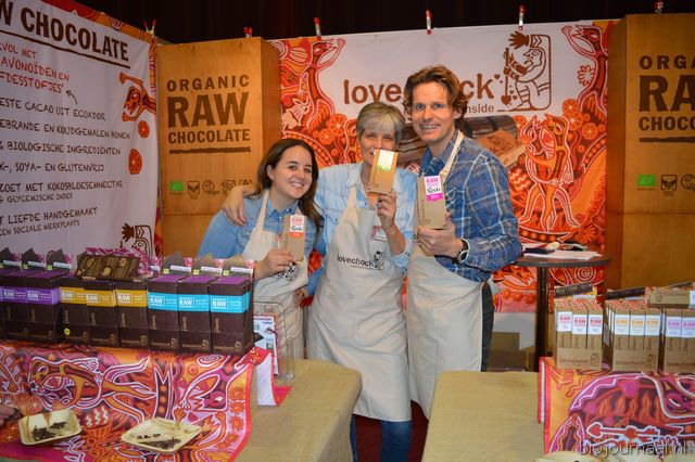 "Laetitia Sanchez, Ellen Moons en Peter-Paul Balk presenteerden op de Bio-beurs de vernieuwde verpakking van de Lovechock Rocks. Ellen: "Met deze verpakking gebruiken we veel minder materiaal. Ook hebben we de kokos-rozijnenvariant vervangen voor hazelnoot- vanille." Begin februari introduceert Lovechock 'Mylk'."