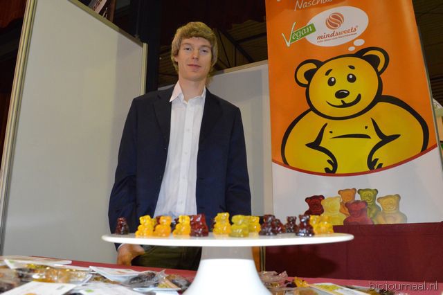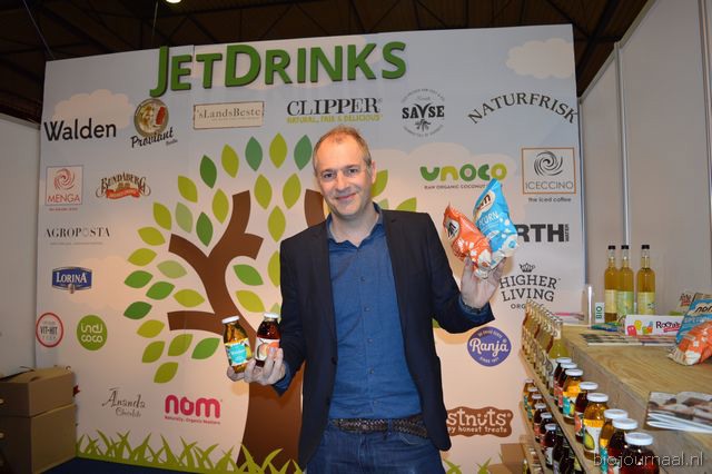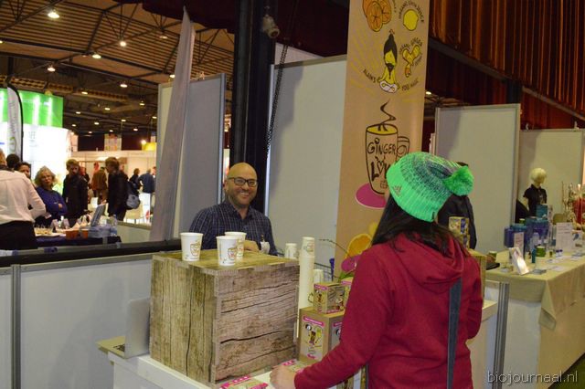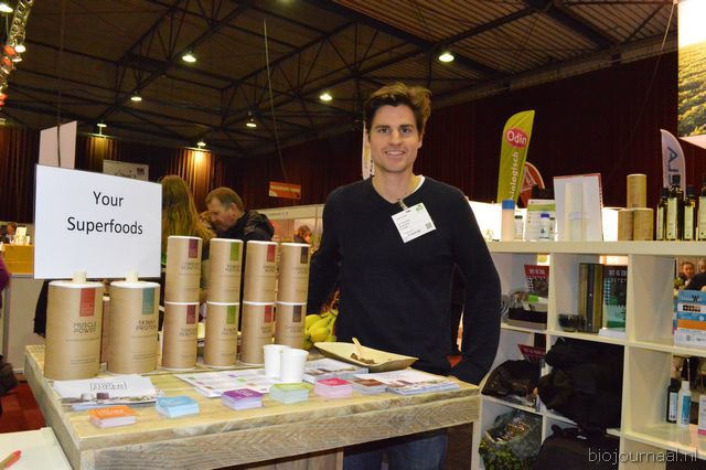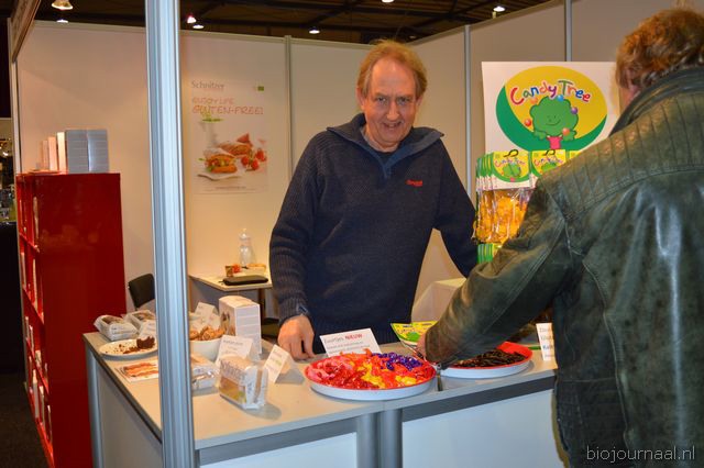 Kees Boender (Your Well) ligt bezoekers in op de stand van Biobites, handelaar in gezonde snacks en tussendoortjes.
